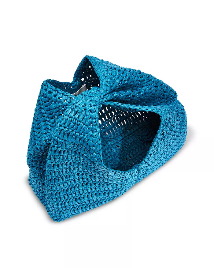 The Simone Bag is woven from 100% raffia in a rich chocolate hue. This mini silhouette features a soft, flexible shape and a twisted handle for a modern, sculptural finish.