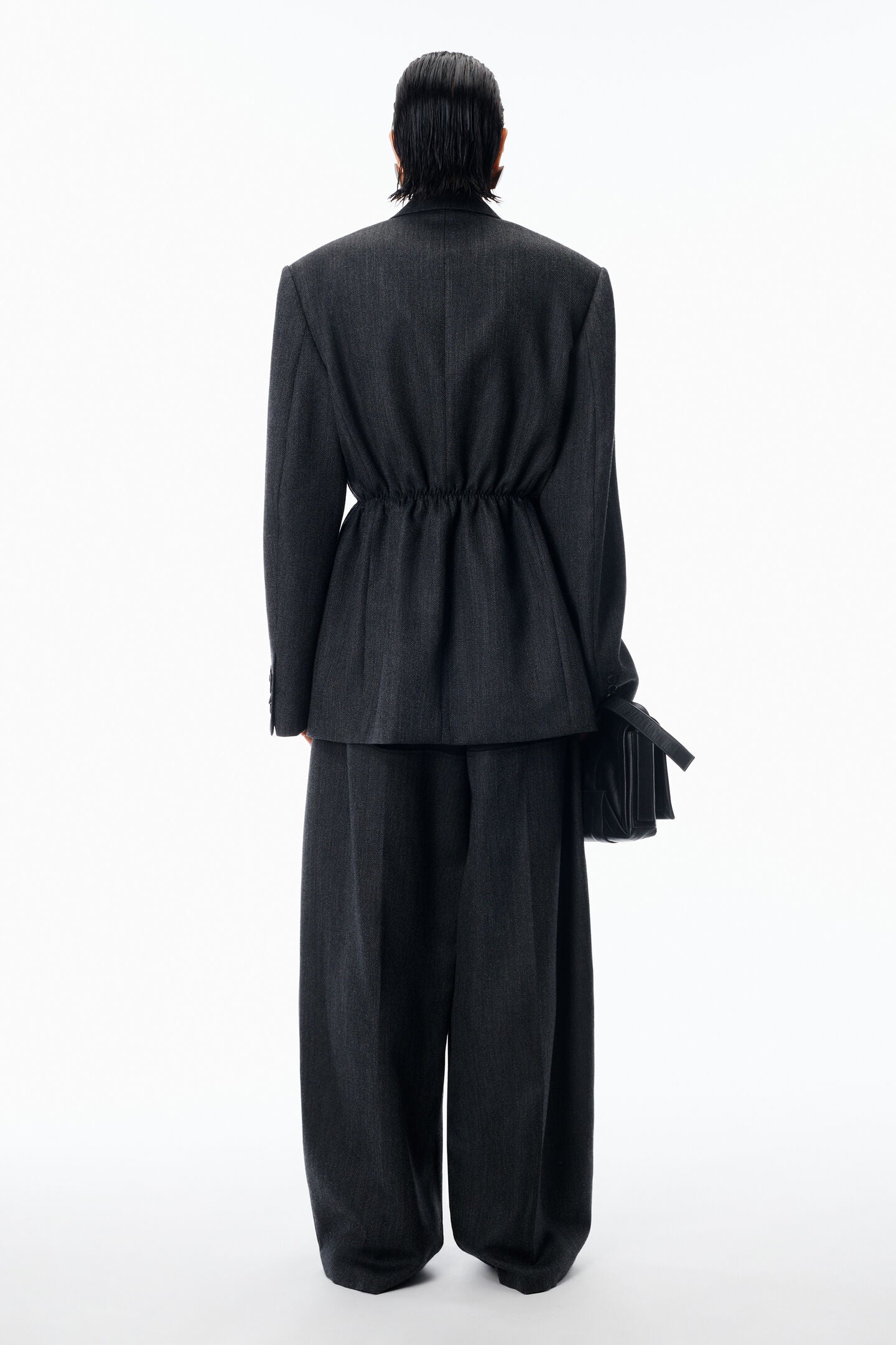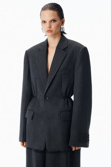 heritage wool twill defines this oversized blazer cut with a boxy silhouette. the ruched waist with zig-zag stitching sharpens the tailoring, while a classic lapel and pocket details balance structure with ease.