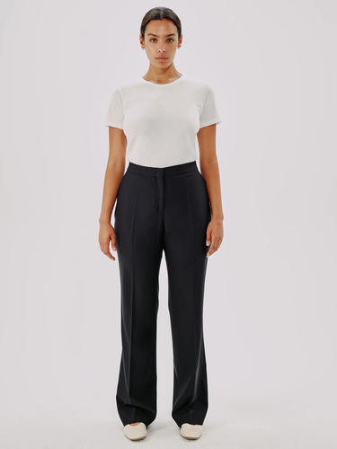 Crafted in seasonless, farm-traceable, custom-made merino wool, this gently-flared trouser plays with proportion. Featuring a slim fit through the hip and thigh and a delicate kick from above the knee,
