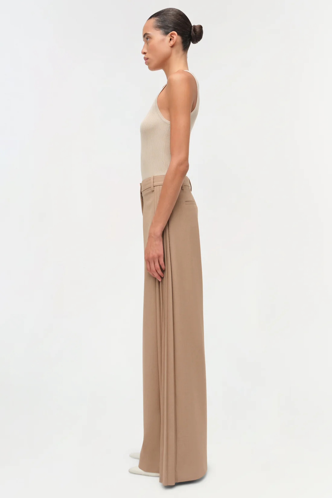 Tailored in soft suiting fabric, these pants fall from a structured waistband into fluid, pleated legs. The wide silhouette moves with ease, balancing precision and flow. An understated essential with modern elegance.