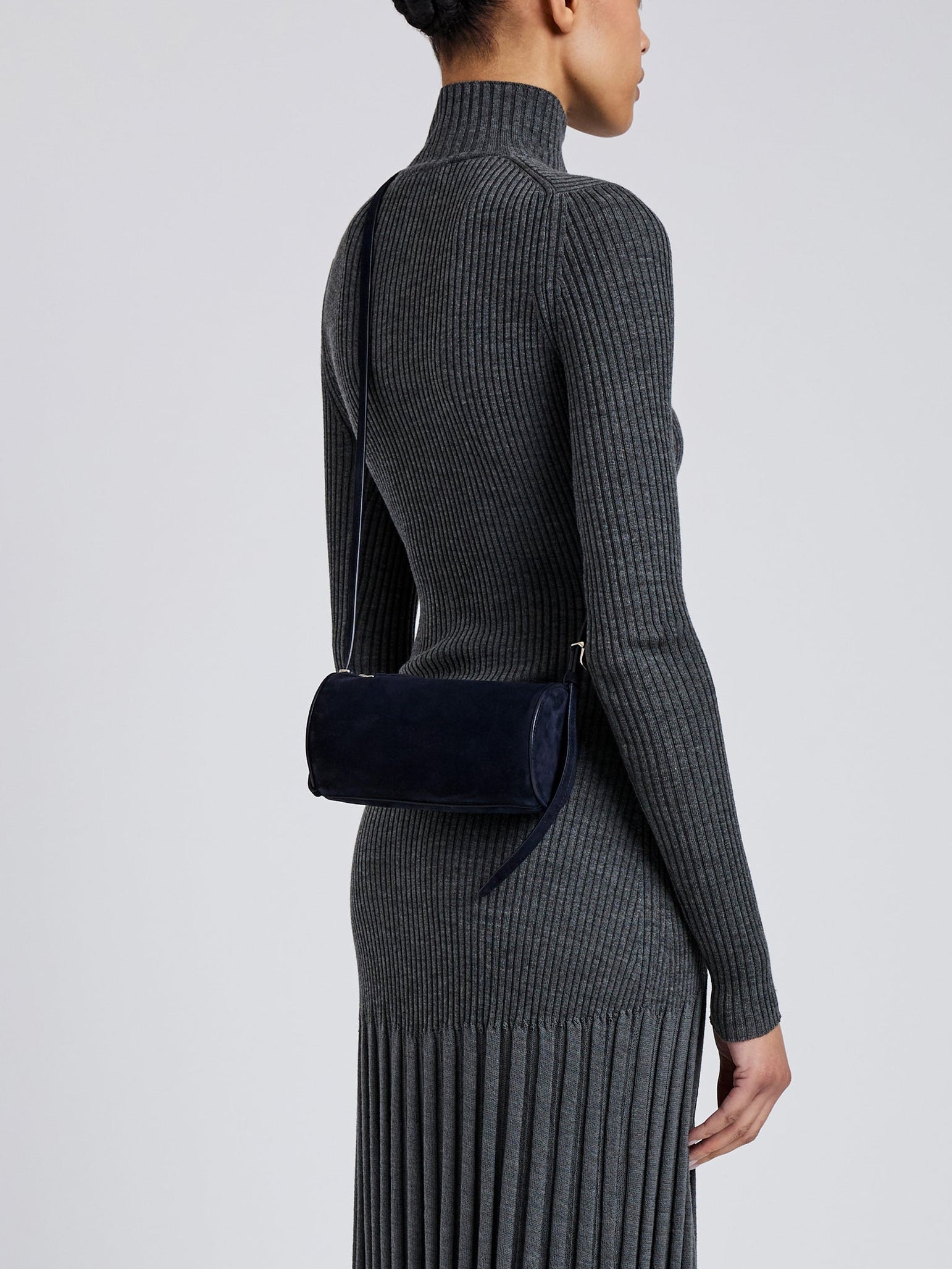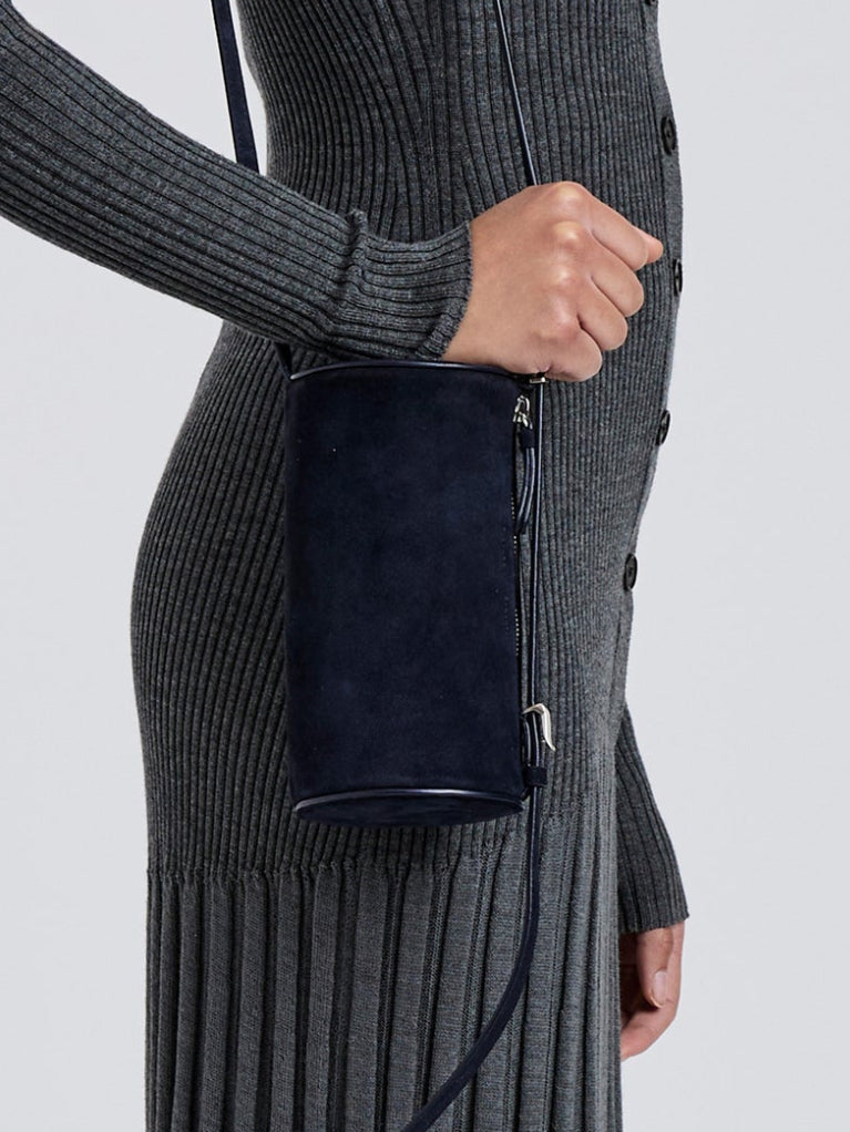 A compact reimagination of the signature Silo silhouette, the Crossbody Silo Bag is crafted from suede to a rounded barrel shape. Designed with a long drop and functional slider hardware, the strap adjusts for crossbody wear or an elongated look. Finished with a leather zipper pull and discreet internal logo.
