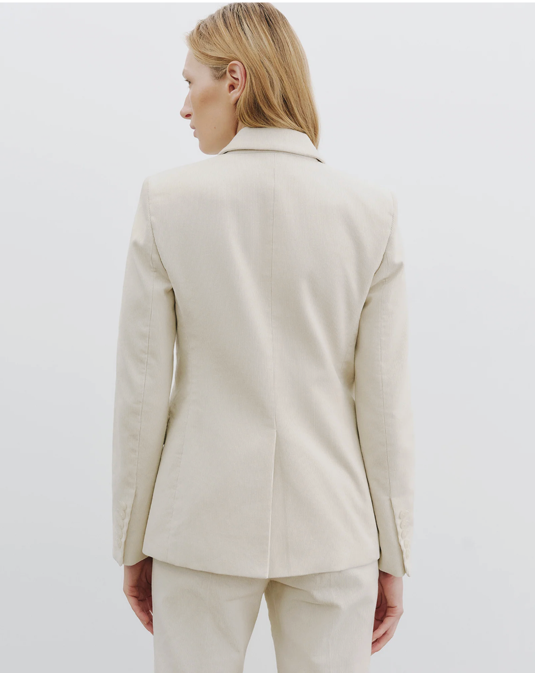 Fitted single-breasted jacket in ivory cotton corduroy. Exaggerated lapel. Darts at front for shape. Structured shoulders with shoulder pads. Chest welt pocket and front flap pockets. Five buttons at sleeves. Back vent. Fully lined with interior chest pockets.