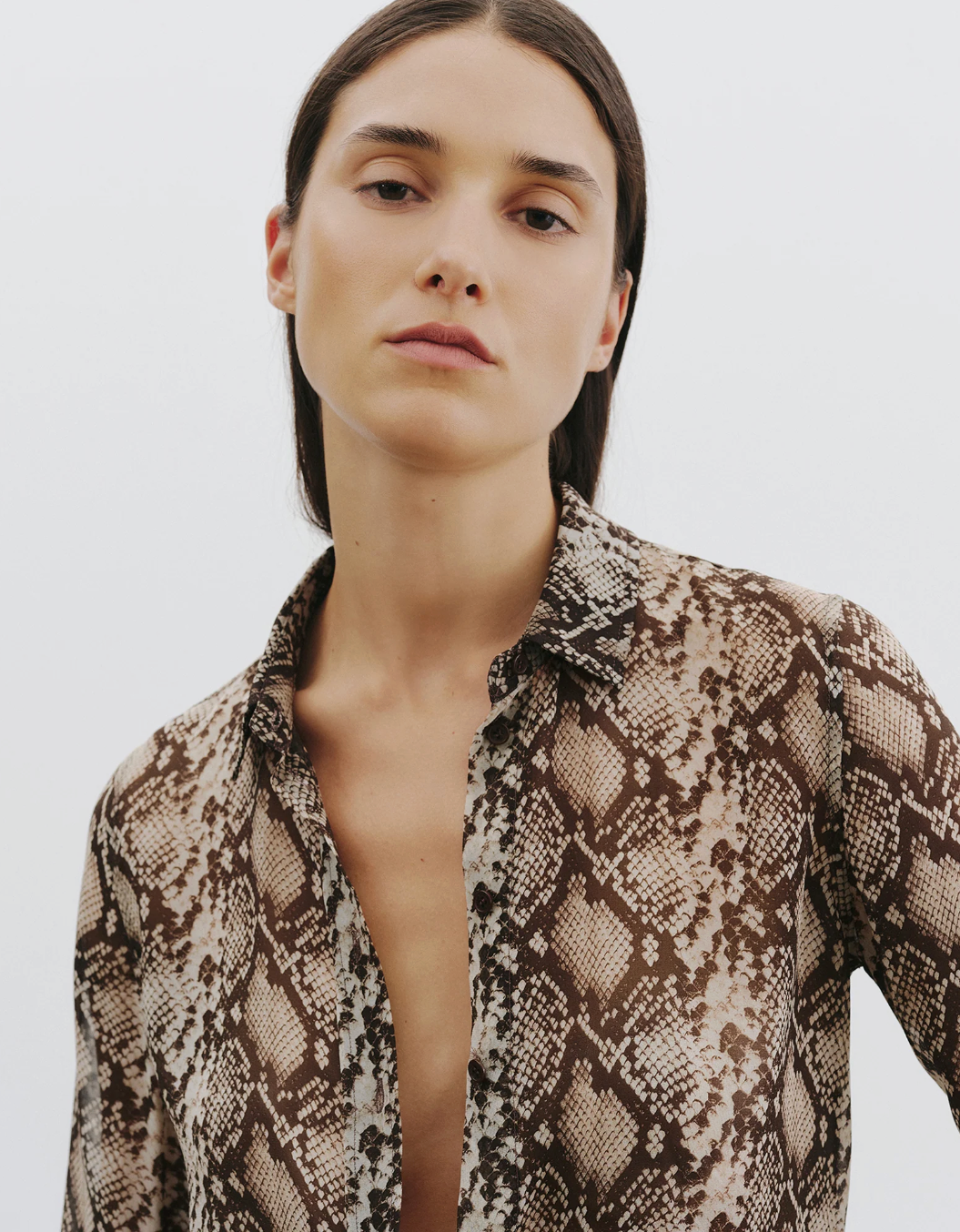 Classic long sleeve collared button up shirt. Straight, slim body. Back yoke. Classic placket details. Stone/Brown Snake Print.
