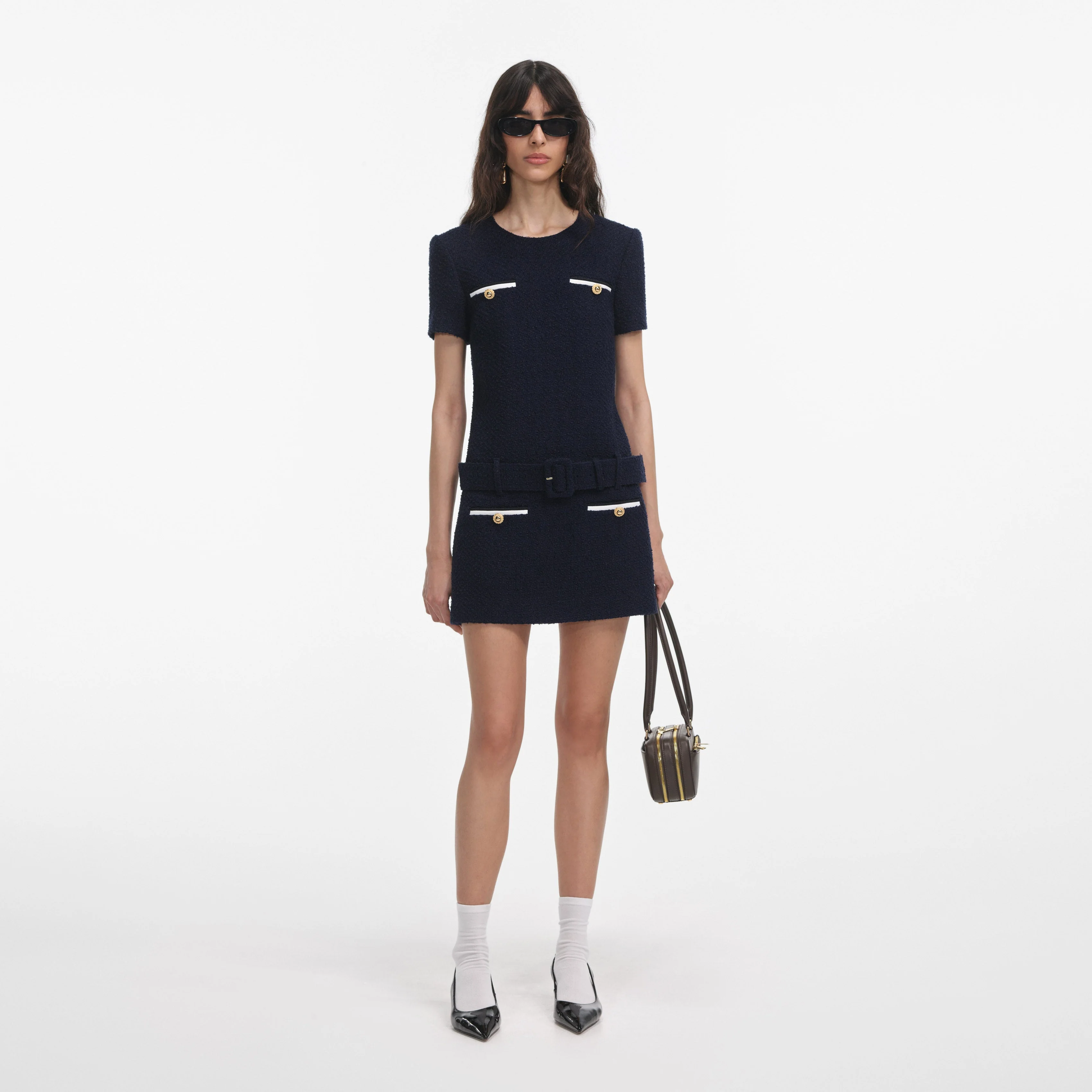 Exude ladylike polish in this navy bouclé mini dress, full of preppy charm with its gold button detailing. A tonal belt adds definition to the waist – pair with brogues for day and heels by night.