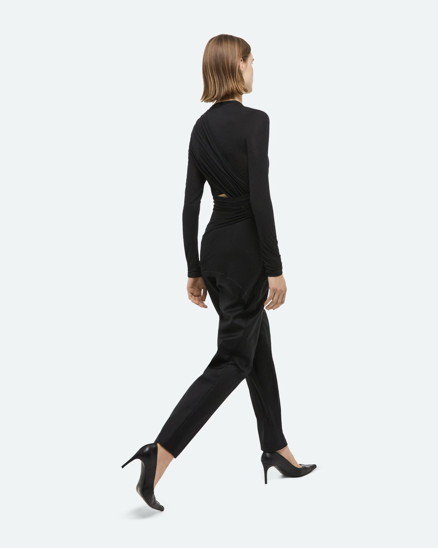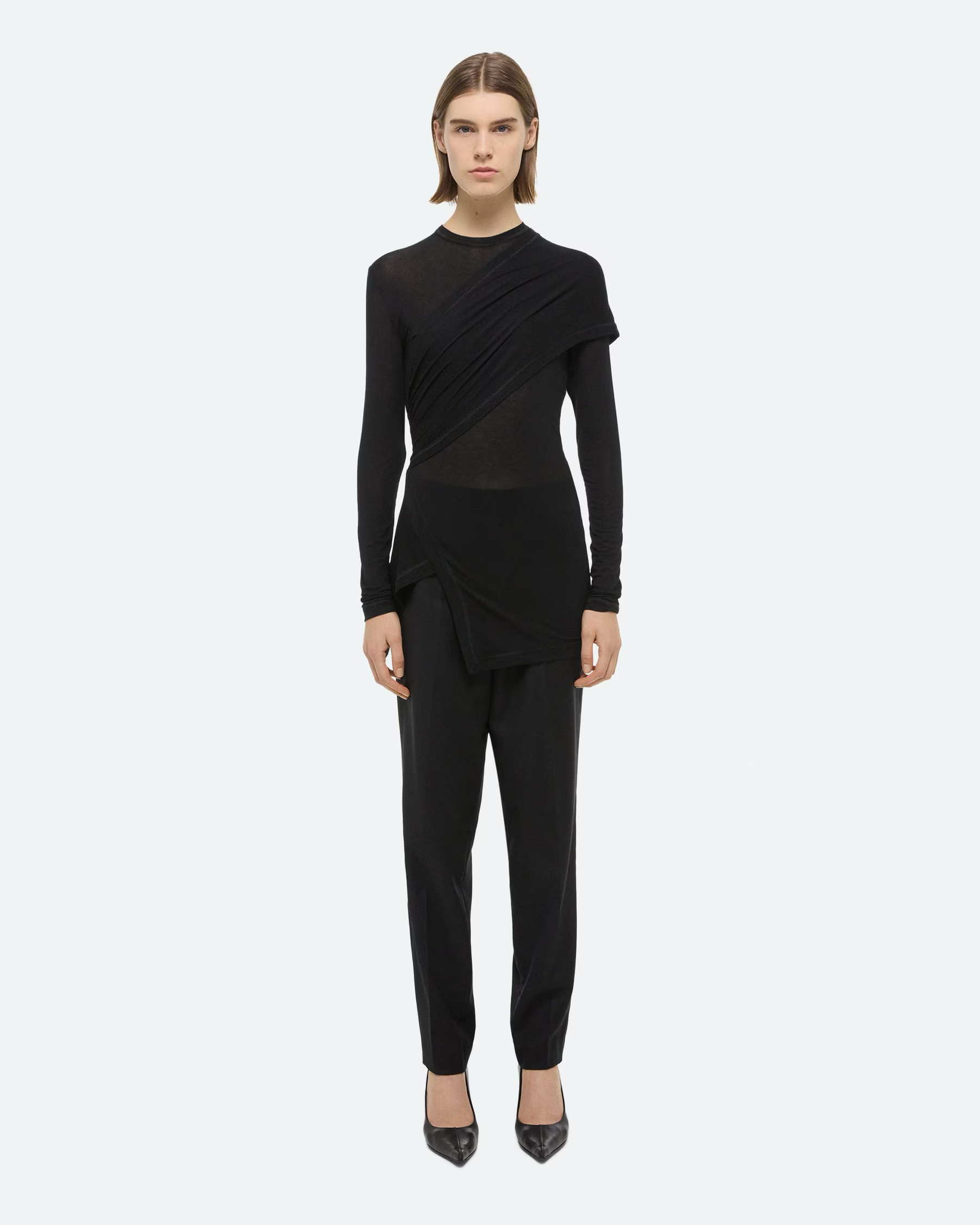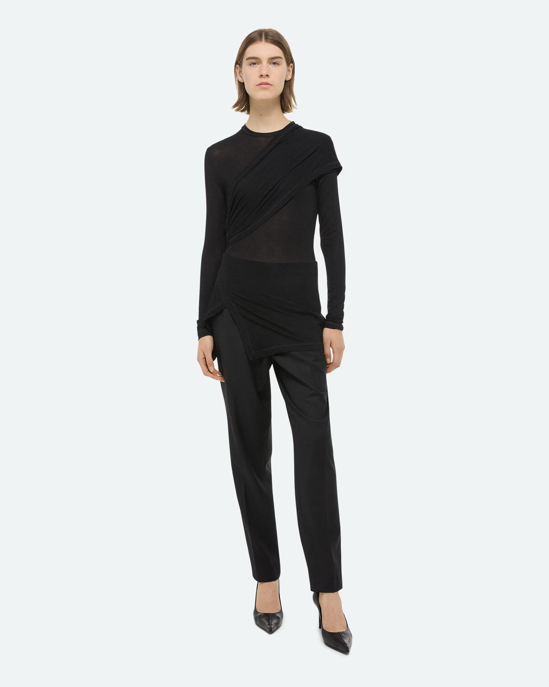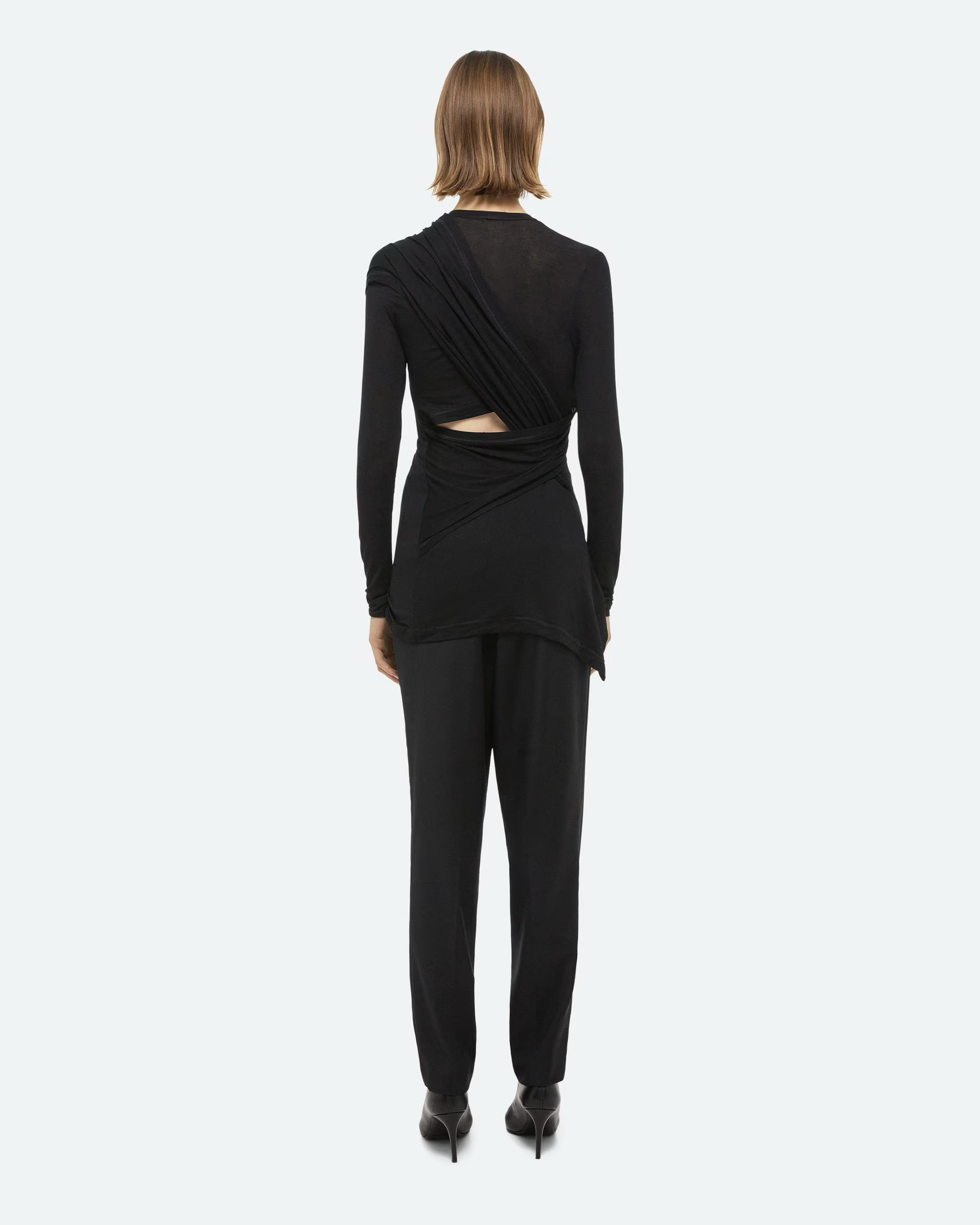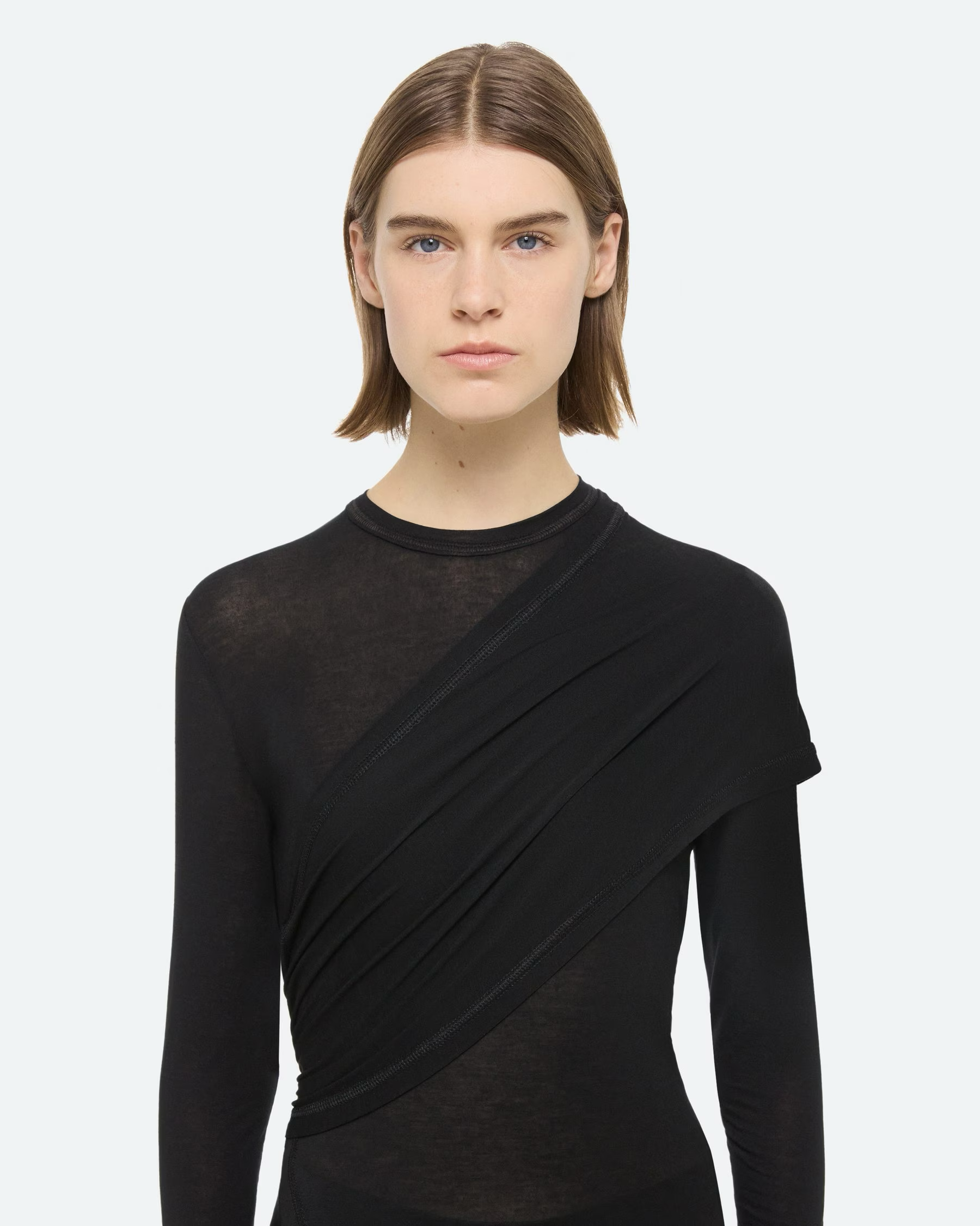 Long-sleeved crewneck top in lyocell jersey. Features a layered design with draped panels that wrap around the body, creating a sense of movement and allowing for flashes of exposed skin.