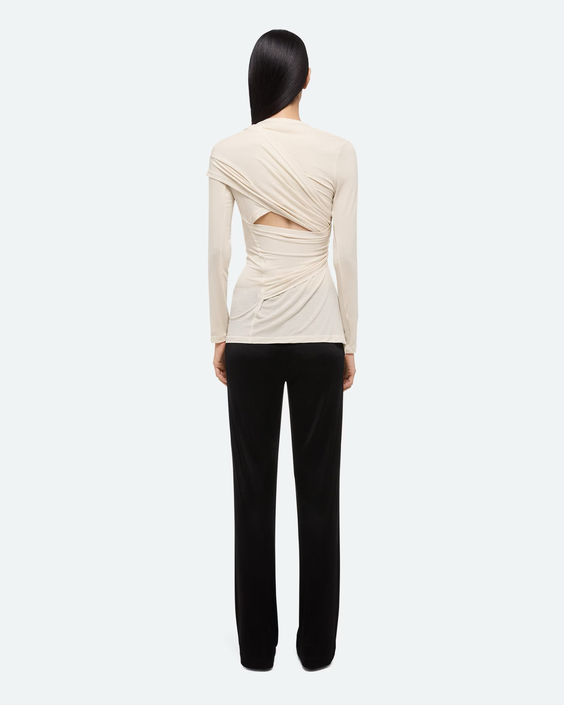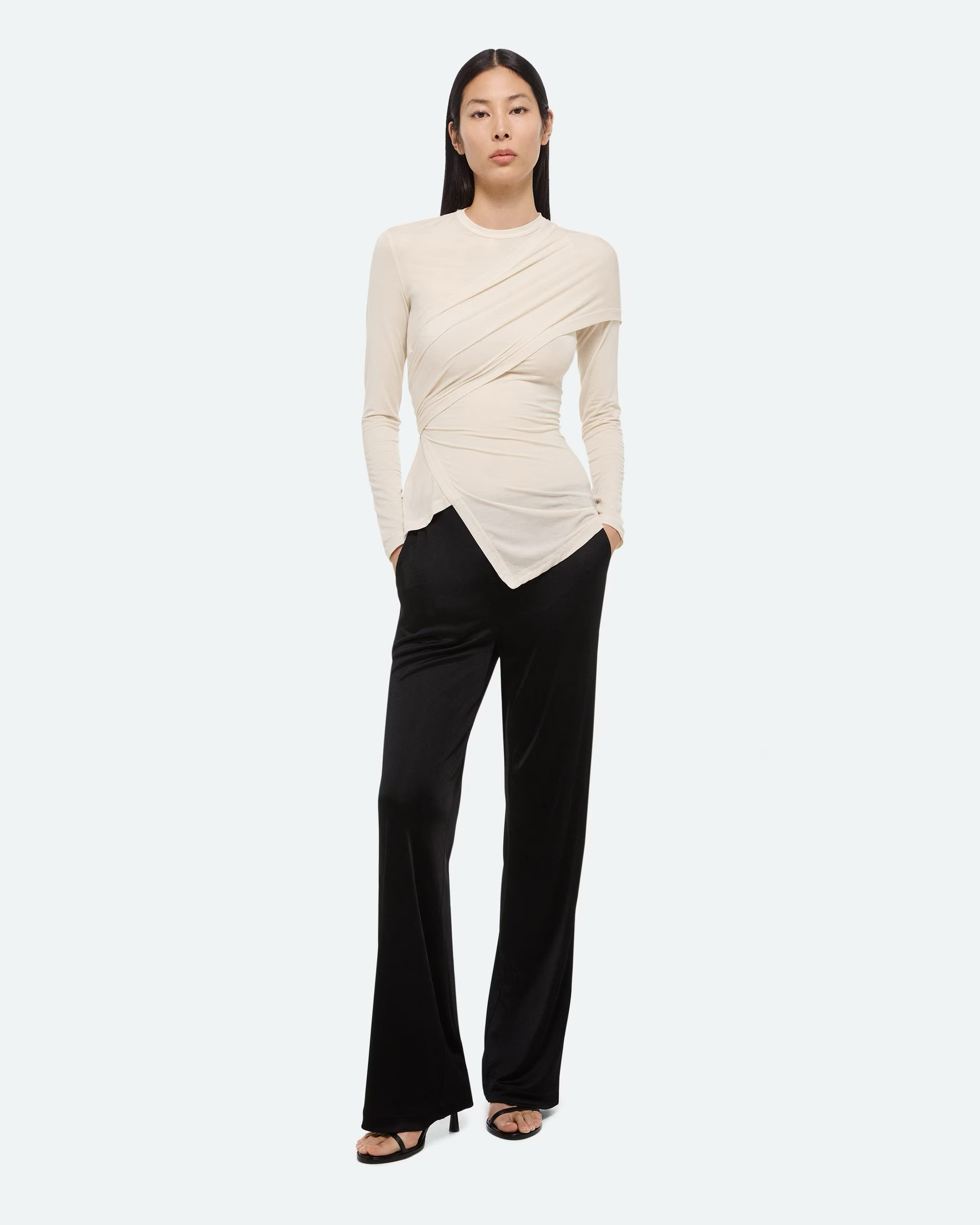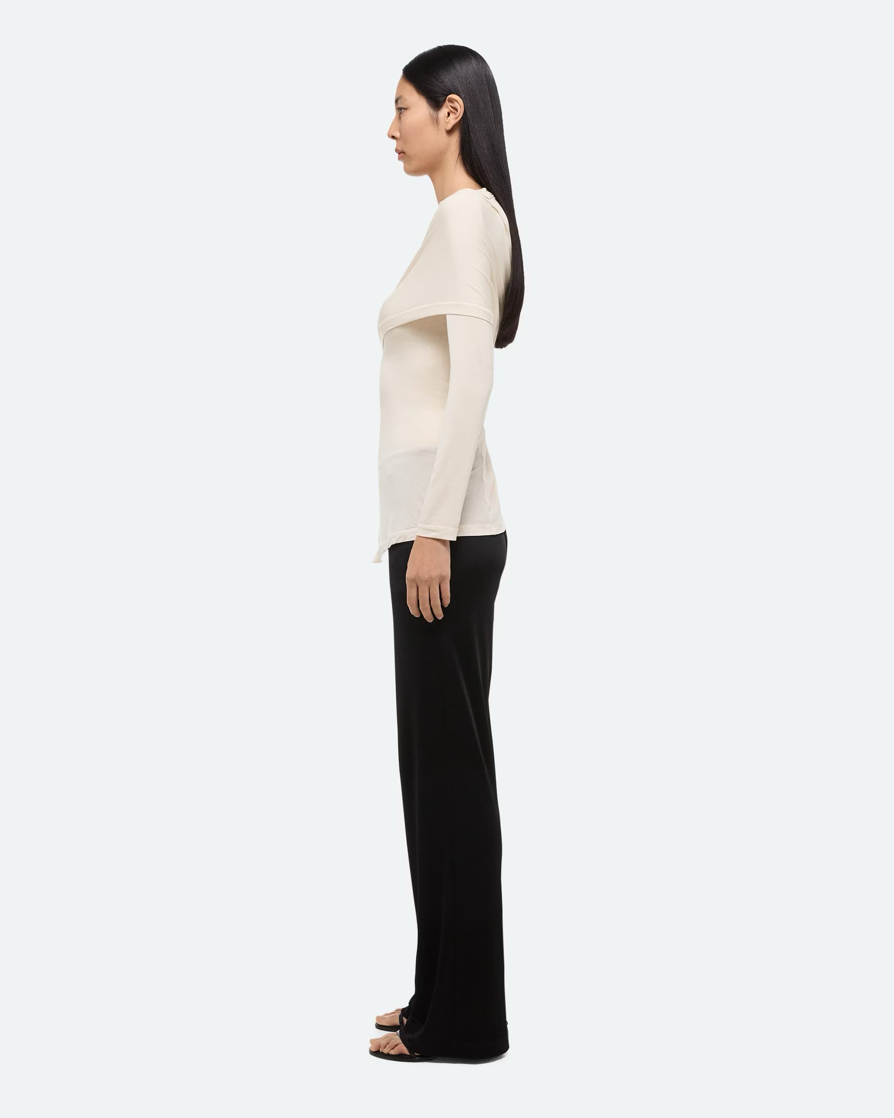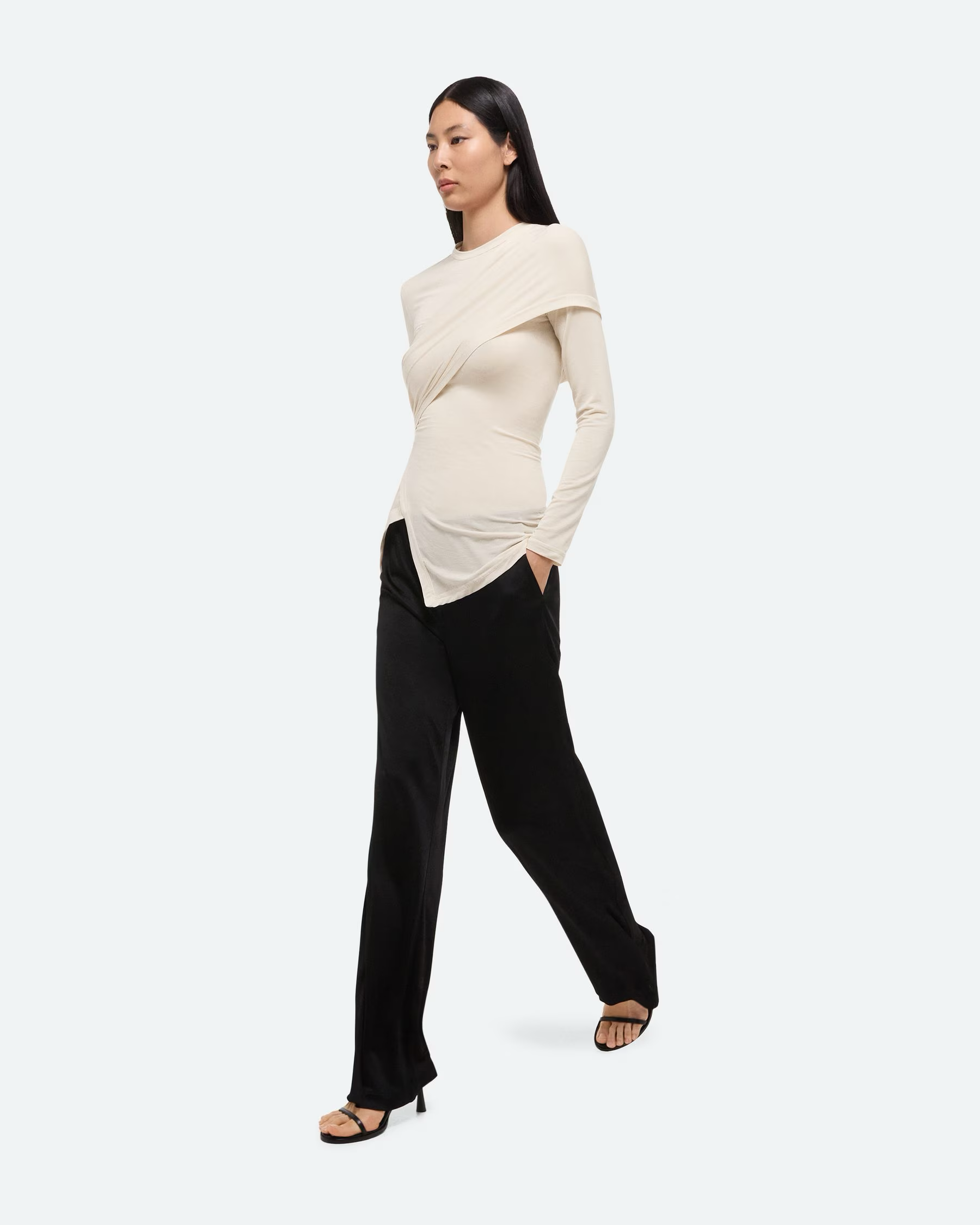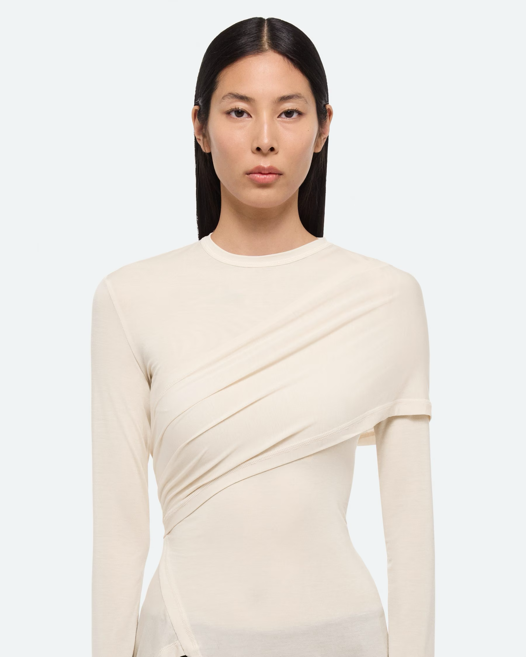 Long-sleeved crewneck top in lyocell jersey. Features a layered design with draped panels that wrap around the body, creating a sense of movement and allowing for flashes of exposed skin.
