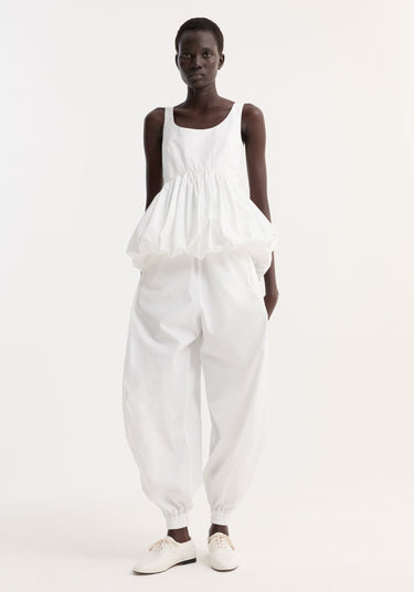 A sleeveless scoop neck top with a low back, defined by a sculptural peplum that shapes the waist and adds architectural elegance to the silhouette.