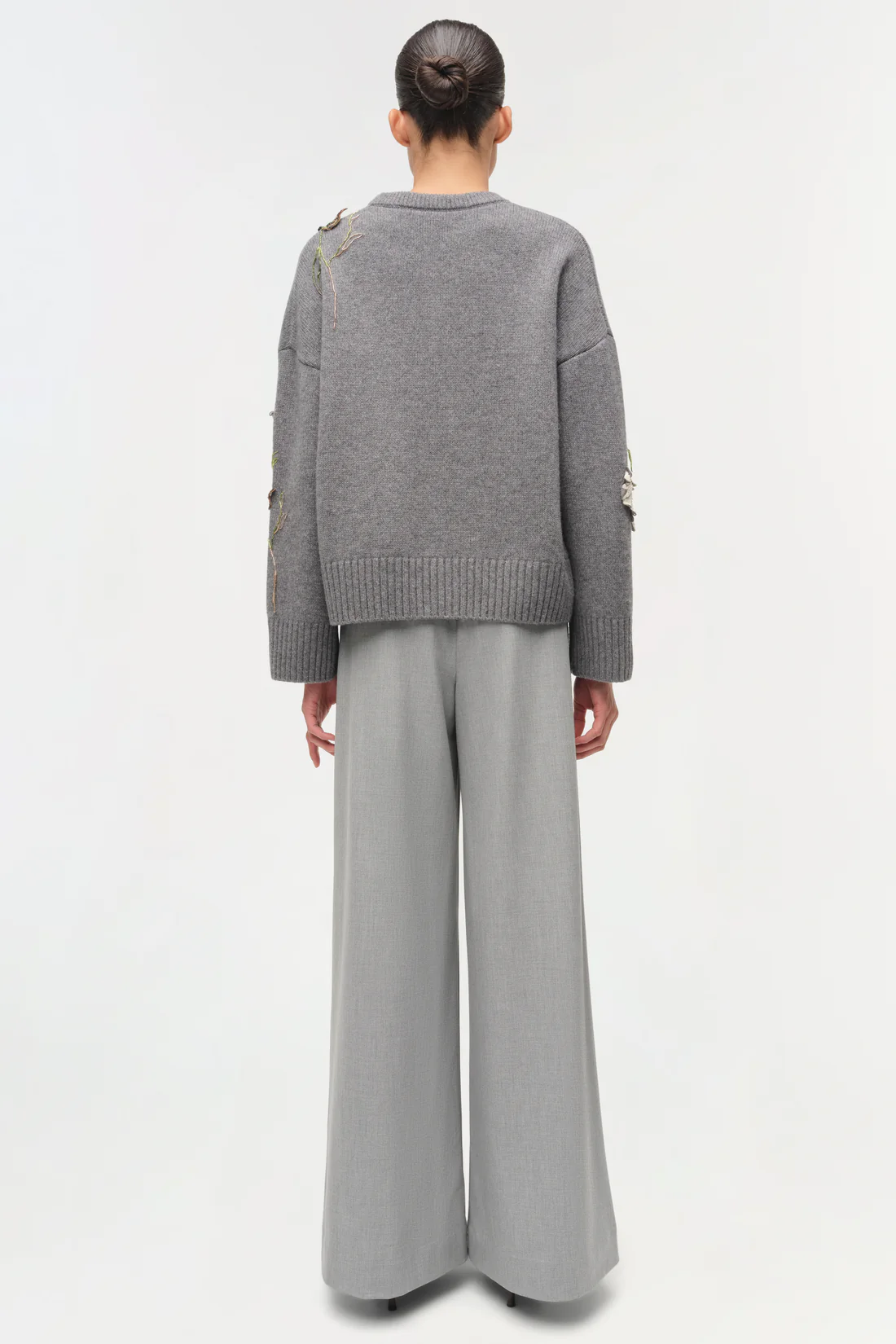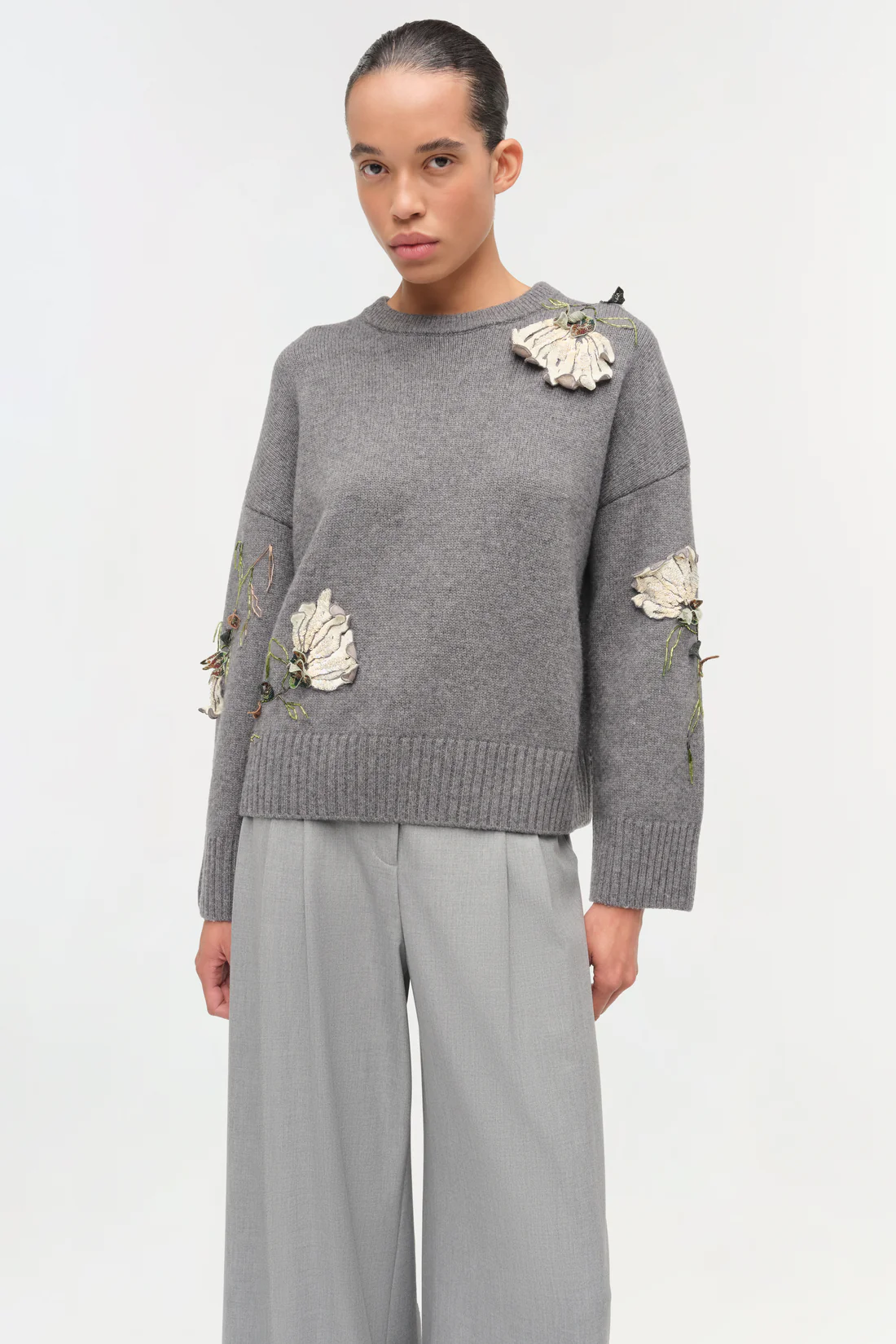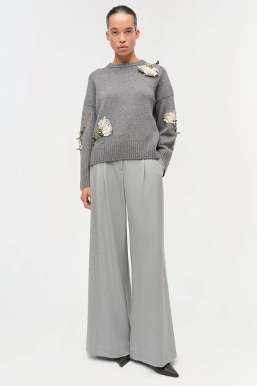 Knit from a soft wool-cashmere blend, this sweater features hand-applied floral embroidery for added dimension. The relaxed silhouette is finished with rib trims at the cuffs and hem. A textured knit elevated by artisanal detailing.