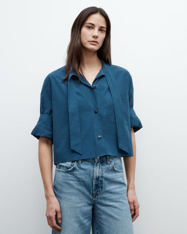 Cropped, short sleeved button down in superfine Italian cotton shirting, with a neck tie at the collar. The Next Ex is a cropped, boxy silhouette. Complete with a chest patch pocket, button up placket, spread collar, and our signature double roll button cuffs.
