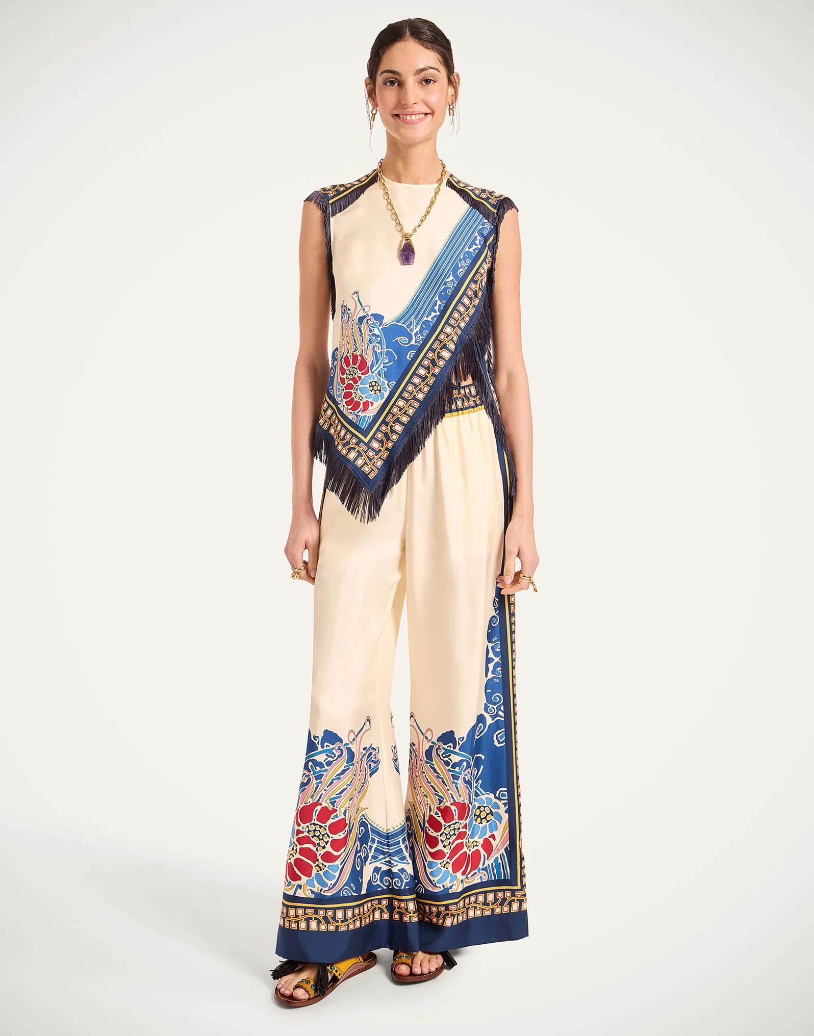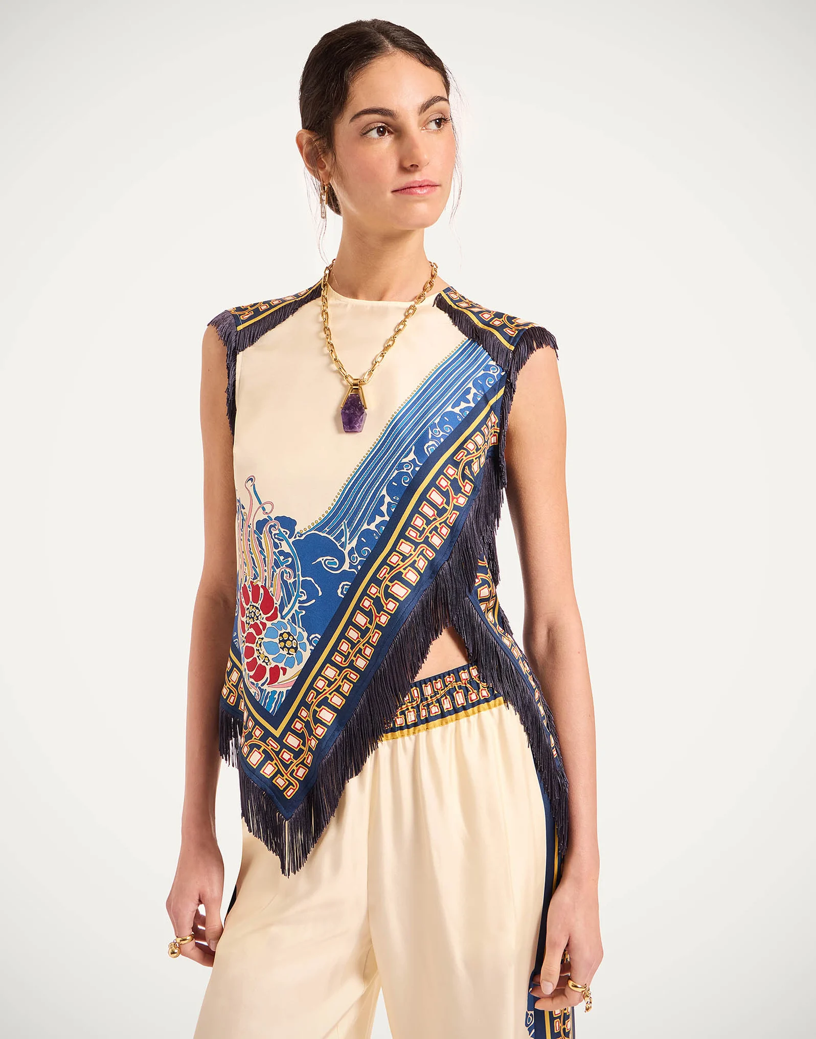 Sometimes we like to show off. Such is the case with this stunning Scarf Top, a stunning example of our Italian artisans’ exceptional craftsmanship, woven together for a contrasting foulard effect with fringe detailing across the armhole and hem. We love the asymmetrical hem and the mini cap sleeve that delivers a strong warrior-queen silhouette. Wear it with the Scarf Skirt for full foulard fabulousness.