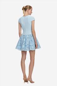 A skater-style lace skirt brings textural intrigue and playful volume to this crepe mini dress in a delectable baby blue hue. Style with sky-high platforms to showcase its romantic scalloped hem.